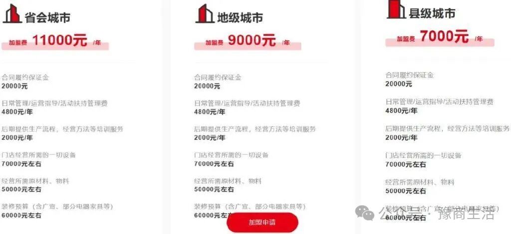 张氏兄弟给产品的定位,就是“高质平价”。 《21CBR》记者查询发现,近期推出的多款新品,价格均在7元以上,如山楂莓莓7元,厚芋泥奶茶9元。年底时,其在多城市涨价1元,一度被推上热搜。 万店版图的扩张,两兄弟主要依仗加盟商,旗下超99%是加盟店。 据蜜雪招商人员介绍,加盟费有三档,省会城市、地级和县级城市,分别为11000元/年、9000元/年和7000元/年;不计转让费和租金,前期投入需21万元以上。