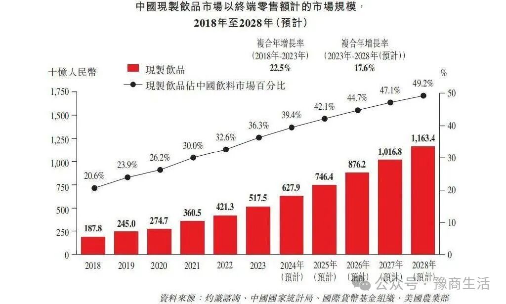 张氏兄弟的视野,则广得多。 招股书援引报告称,中国现制饮品的规模,预计从2023年的5175亿元增至2028年的11634亿元,复合年增长率17.6%,到2028年,现制饮品将占据中国饮料市场一半份额。