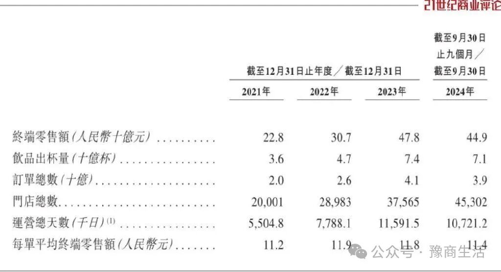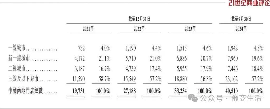 两人持有蜜雪冰城的股权,合计比例超过85%。据《2024胡润百富榜》,IPO前其身家各达225亿元。 张氏兄弟正在努力延续造富神话,预计敲钟所募集的数十亿,准备用于提升蜜雪冰城供应链的广度和深度,加大推广力度。 一位湖南地区加盟商向《21CBR》记者透露,2024年底,蜜雪总部调整加盟政策,乡镇开店须本市户籍,且鼓励新加盟商挖掘空白的乡镇市场。 万店霸主 “你爱我,我爱你,蜜雪冰城甜蜜蜜。”张氏兄弟的茶饮生意相当“甜蜜”。 截至9月末,蜜雪冰城4万多家门店,覆盖全国超过300个地级市、1700个县城,遍布中国的城乡,在下沉市场拥有高渗透率。 2024年1-9月,其GMV即高达450亿元,全年GMV有望上冲到600亿。 期间,蜜雪冰城进账187亿元,超过古茗、茶百道、沪上阿姨三家的总和,净利润达35亿元,同比大增42.3%。须知,其一杯单价只有6元。